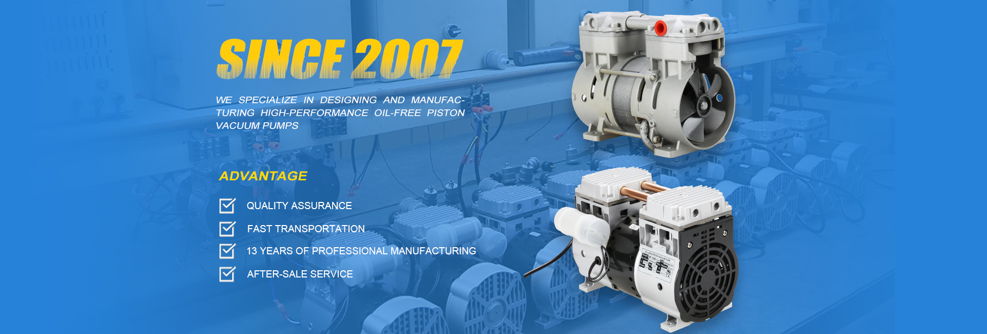 东莞市超微真空科技有限公司是一家专业从事无油活塞式真空泵以及空气压缩机的企业。超微真空具有多年的产品研发经验和生产制造经验,拥有完善的成套生产设备,以及先进的检测设备,产量和质量均达到行业先进水平。公司凭借优秀的综合实力,通过了ISO9001国际质量管理体系认证,产品也通过UL,CE等国际认证,广泛应用于医疗,美容,自动化等多个行业领域,享誉国内外。我们始终坚持“积微成著,超越自我”的企业精神,以人性化管理,打造一流的团队,一流的产品,致力于成为全球优秀的无油活塞式真空泵以及空气压缩机供应商,竭诚为国内外客户提供优质的产品和服务。